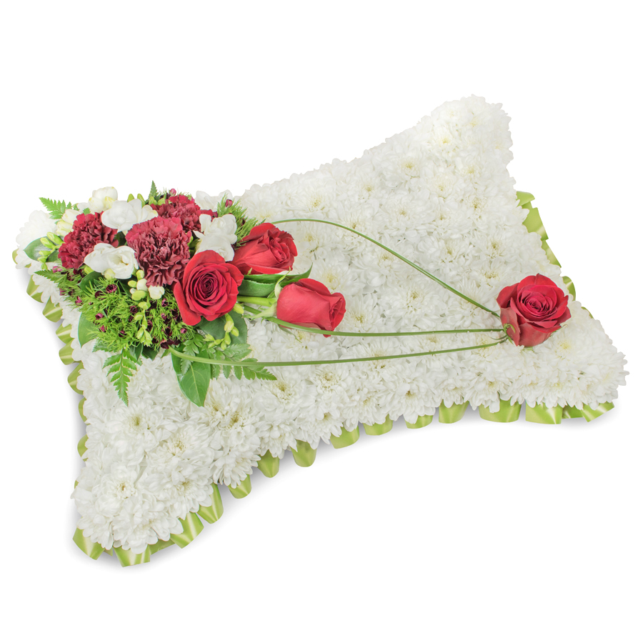 Convey your heartfelt sympathy with our elegant flower arrangement, featuring a graceful mix of white chrysanthemums, red roses, white freesias, dark red carnations, dianthus, and bear grass. Each bloom is hand-selected to ensure the highest freshness and quality.