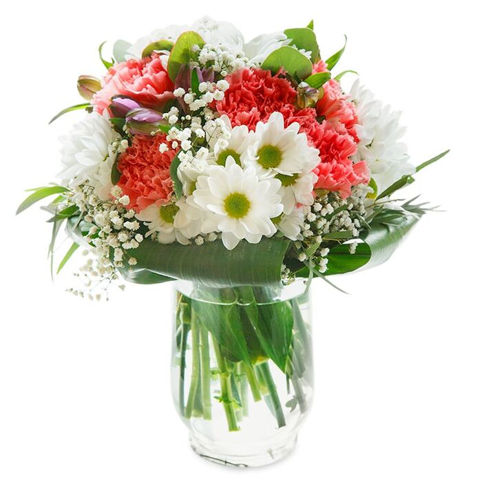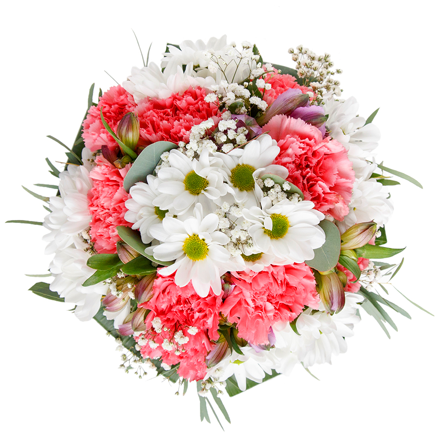Brighten someone's day with our luxurious bouquet, a stunning combination of snow-white chrysanthemums, airy gypsophila, and soft pink carnations, elegantly arranged with vibrant aspidistra leaves.